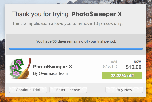 The trial version of PhotoSweeper X only allows you to remove up to 10 items. A full version is required to remove the limits and costs $10 USD.